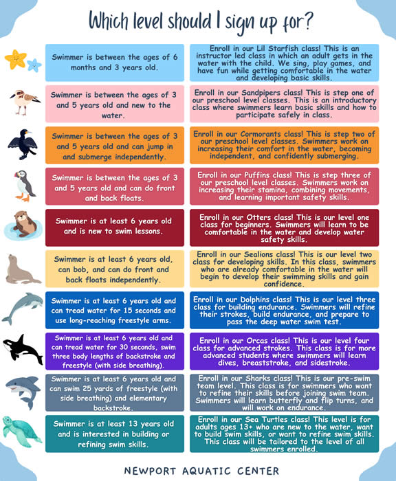 Lil Starfish is for children age 6 months to 3 years. Preschool group lessons (Sandpipers, Cormorants, and Puffins) are for ages 3-5, and other group lessons (Otters, Sealions, Dolphins, and Orcas) are for ages 5-12. Pre-swim team level (Sharks) is for ages 6-17. Adult class (Sea Turtles) is for ages 13 and over.
