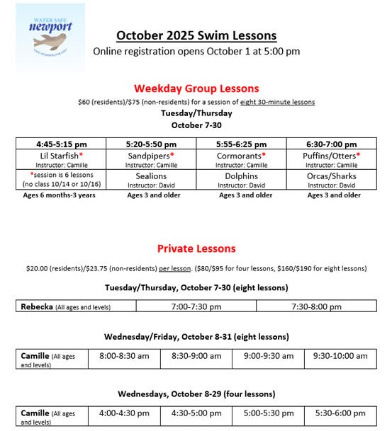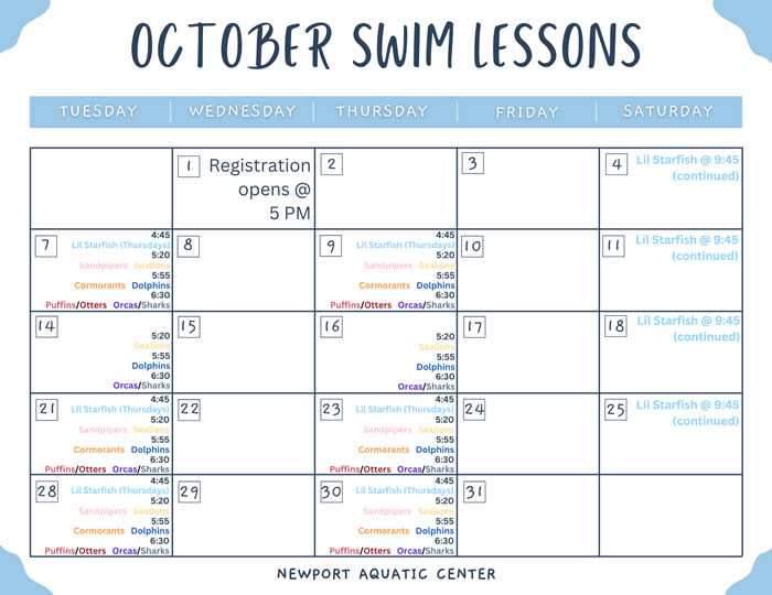 At the Newport Aquatic Center, we offer swim lessons for all ages and abilities. We provide both group and private lessons throughout the year. CLICK HERE to join our swim lesson notification email to stay up to date on upcoming swim lesson sessions and registration dates.